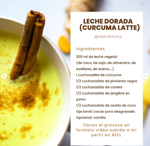 También se conoce como CÚRCUMA LATTE, hay numerosas formas de hacerla y diferente mezcla de especias (por stories os he contado las que yo compro ya preparadas, pero podéis hacerla en casa).