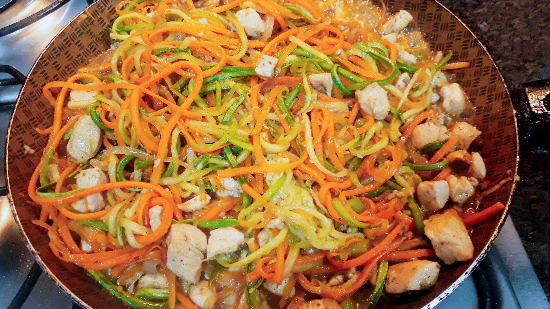 👩🏽🍳Corta el calabacín y la zanahoria con forma de espagueti, quita el exceso de agua con papel de cocina y saltea 5’ en una sartén con aceite